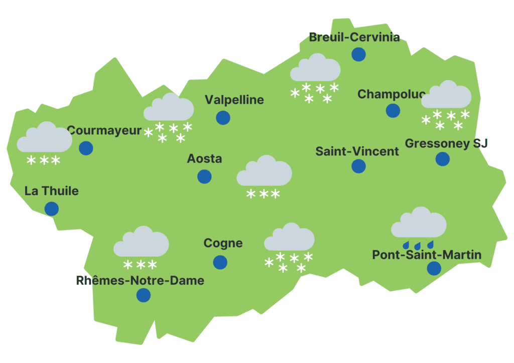• altrove gli accumuli oscilleranno fra e 5 e 10 cm, 1-5 cm ad Aosta città.