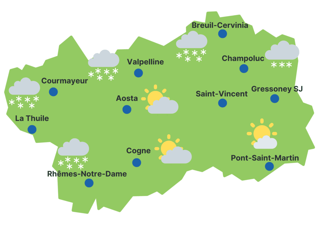 Cielo: molto nuvoloso sulle alte valli occidentali e settentrionali (Valdigne, Valli del San Bernardo, alta Valtournenche e Monte Rosa), altrove parzialmente nuvoloso; più soleggiato in bassa valle