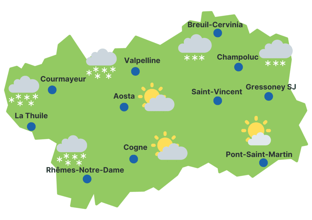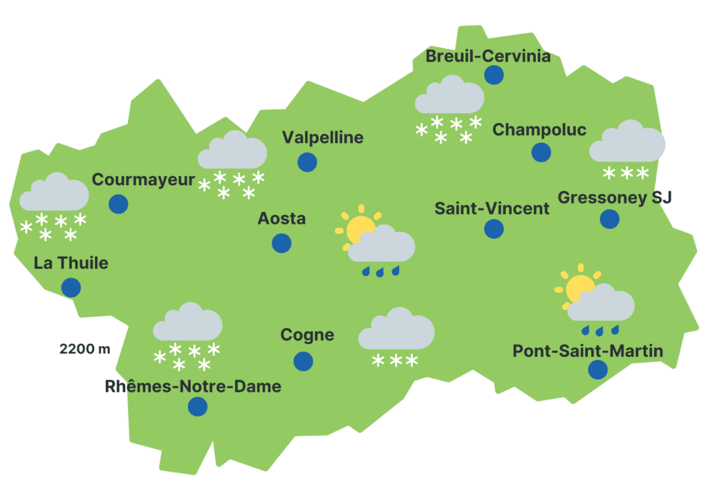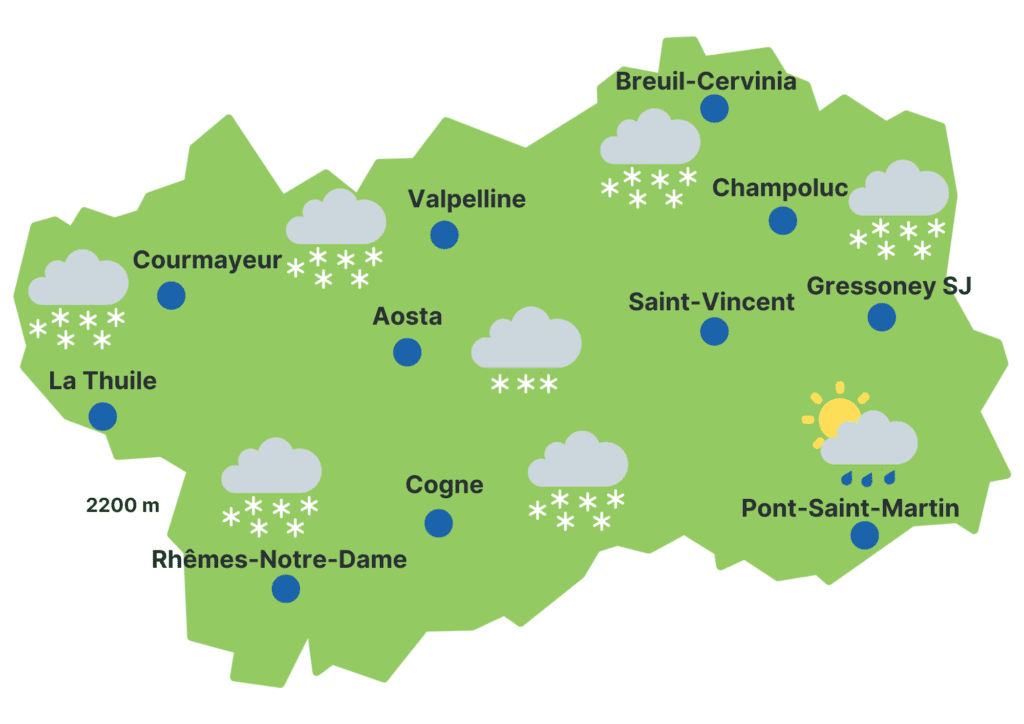 Precipitazioni: fino al mattino nevicate moderate diffuse, a tratti intense sulle zone di confine tra Rutor, Bianco (La Thuile e Courmayeur), Gran San Bernardo, Valpelline e alta Valtournenche; da metà pomeriggio i fenomeni tendono a ritirarsi sui sopra citati settori di confine, altrove divengono più deboli o del tutto assenti sulle zone di sud-est. Limite neve al mattino sui 500 m, in rialzo a 1000-1300 m in giornata a est, sui 900-1000 m a ovest