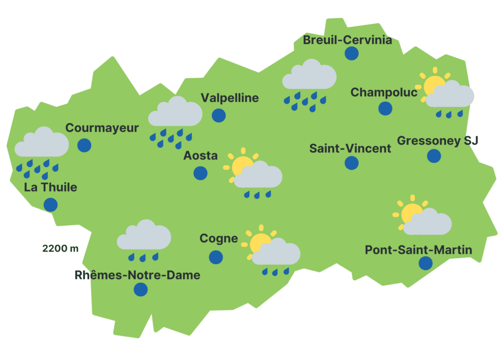 Precipitazioni: tra la notte e l’alba deboli sulle creste di confine, poi asciutto. Dal primo pomeriggio nuove precipitazioni a partire dai settori occidentali in estensione a buona parte della regione (fenomeni intermittenti sul fondovalle aostano o del tutto assenti a confine con il Piemonte). Picchi localmente sulle zone di confine tra Bianco, Rutor, Valli del San Bernardo, Cervino e Rosa. Limite neve sui 3100-3300 m nel primo pomeriggio, in rapido calo fino a 2000-2200 m in serata sulle zone di confine occidentali, 2200-2400 m su quelle di confine orientali (altrove limite neve 200-300 m più alto rispetto ai valori indicati)