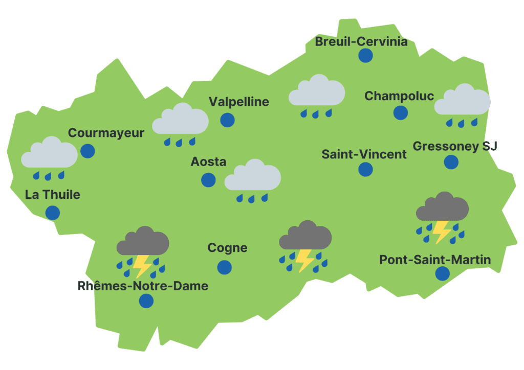 Precipitazioni: al mattino formazione di rovesci e temporali sui settori meridionali della regione (specie sui settori del Gran Paradiso tra Cogne, Val di Rhemes, Valsavarenche) in spostamento verso le zone occidentali. Dalle ore centrali rovesci e temporali anche sulle zone orientali in spostamento verso nord. Fenomeni in cessazione nel corso del pomeriggio, ma permangono rovesci e piovaschi sulle creste di confine tra Rutor, Bianco, Cervino e Rosa. Limite neve inizialmente sui 2100/2200 m, in calo fino a 1800-2000 m sotto i rovesci più intensi.